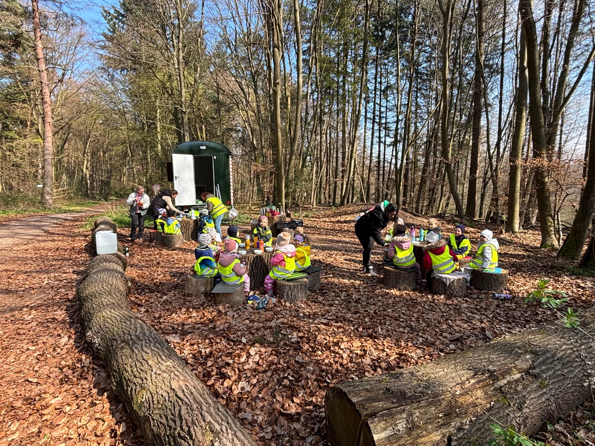 Ein besonderer Höhepunkt war die Einweihung des Bauwagens, der künftig als fester Anlaufpunkt dient. Mit viel Engagement und Teamarbeit umzäunten die Kinder das "Kita-Grundstück" mit Baumstämmen und gestalteten ihren Waldplatz aktiv mit. Auch die selbstgebauten Tische und Stühle aus Holzstämmen kamen direkt zum Einsatz: Gemeinsam wurde dort gefrühstückt und zu Mittag gegessen. Das frisch in der Kita zubereitete Mittagessen wurde dafür extra in den Wald gebracht.